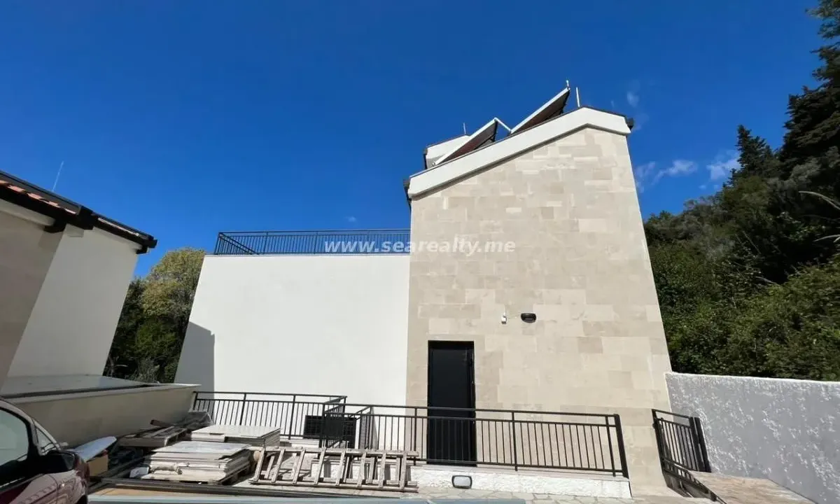 For Sale: A Luxurious House in Tivat spanning 280 sqm plus stairs, sauna, and a pool, priced at 895 thousand euros. It has no encumbrances and limitations and comes with a usage permit, a rarity in ma